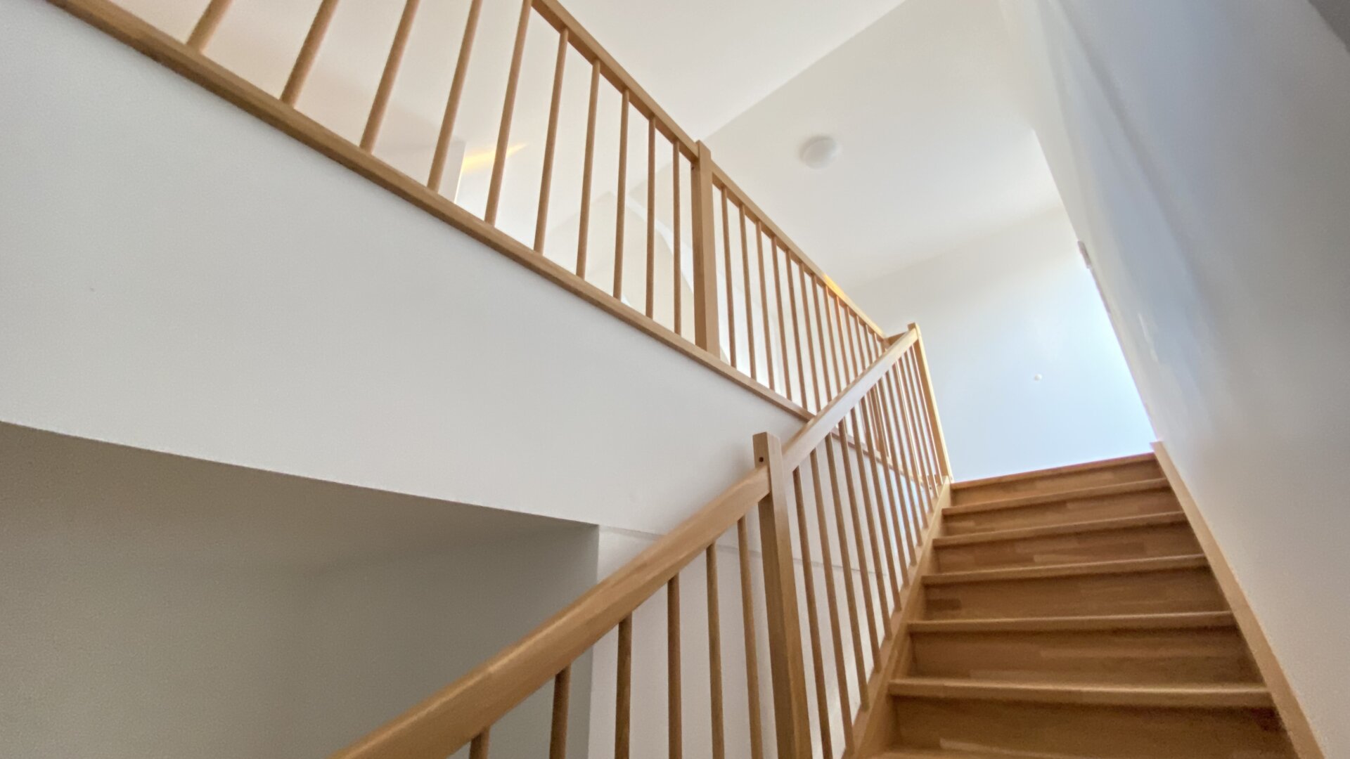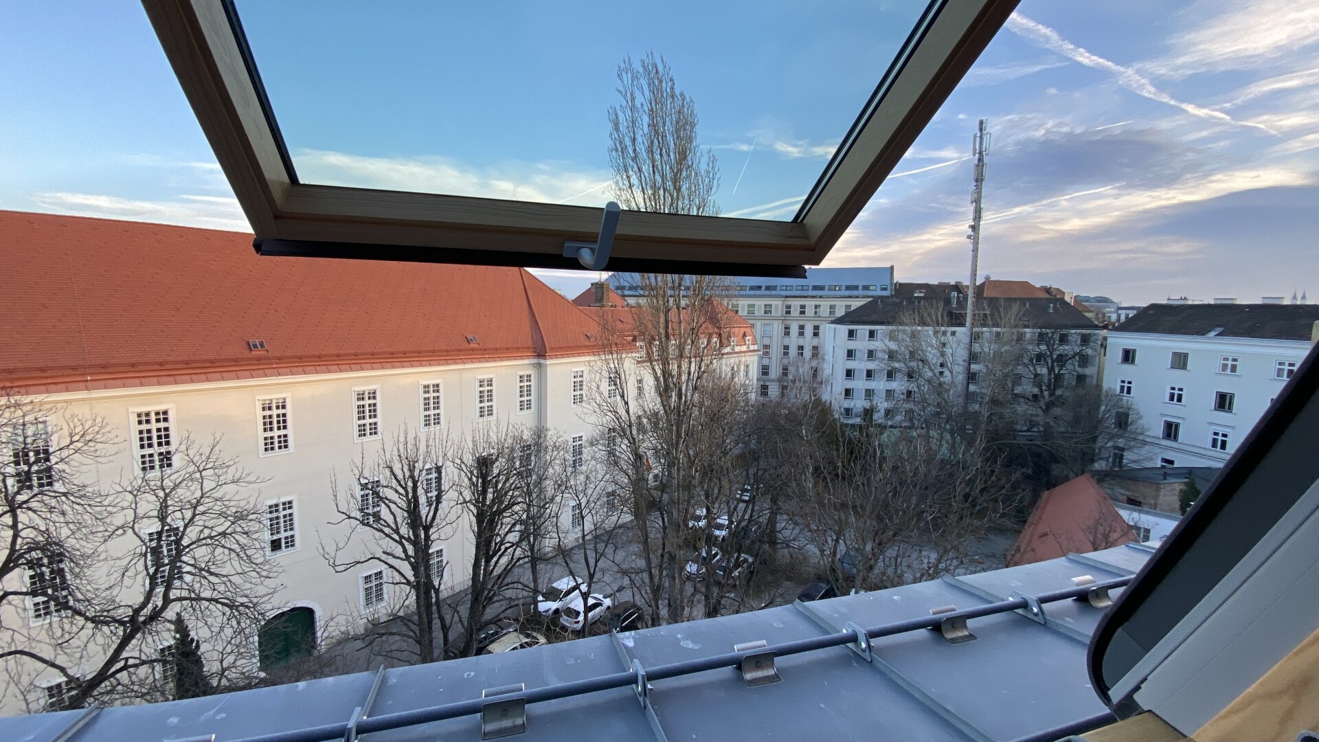 Zugang zur Galerie schafft eine Holztreppe im Eingangsbereich. Die offen gehaltene obere Wohnebene bietet Raum für einen Arbeitsplatz oder auch eine kleine Bibliothek. Über die Galerie ist auch der Zugang zur Dachterrasse mit sensationellem Blick über die Dächer Wiens sowie Fernblick bis zum Kahlenberg gegeben.